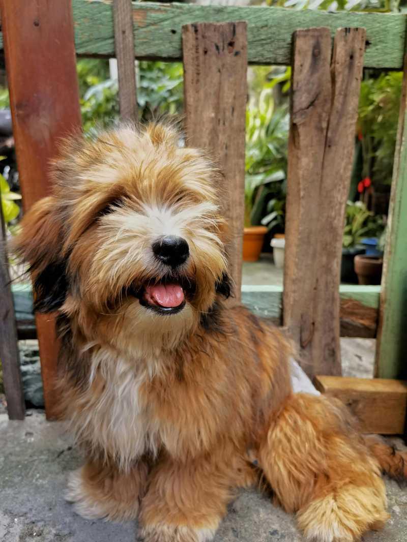 brown long coated puppy near the wooden fence