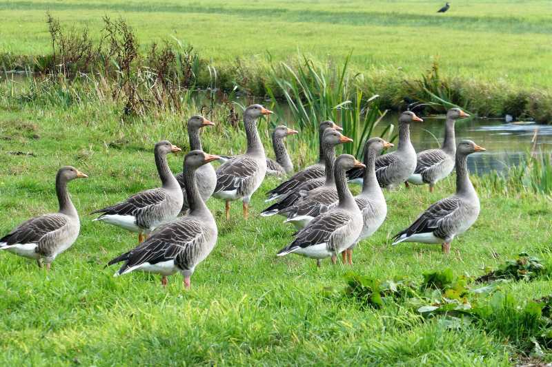 Flock of Greylag Geese Grazing in Green Meadow by a River