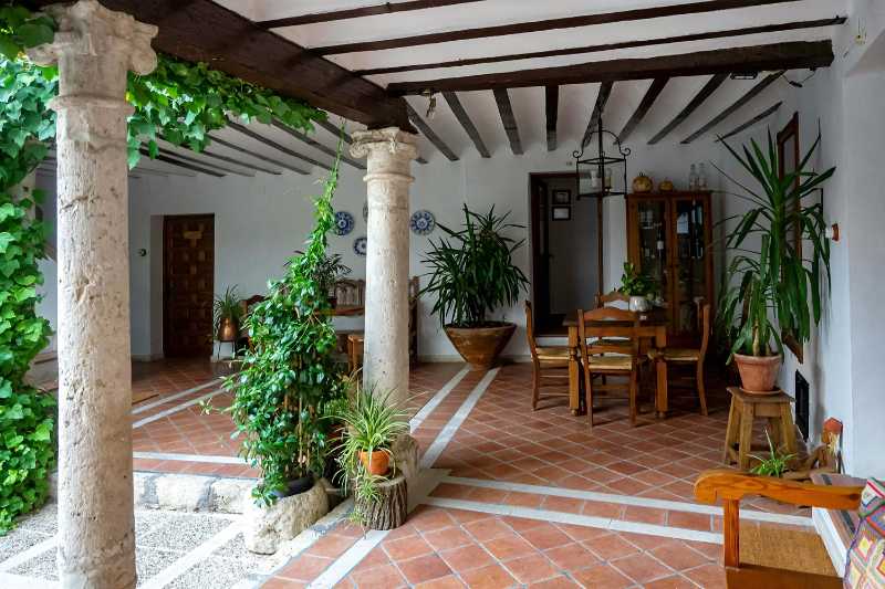 patio with wooden furnitures and green plants