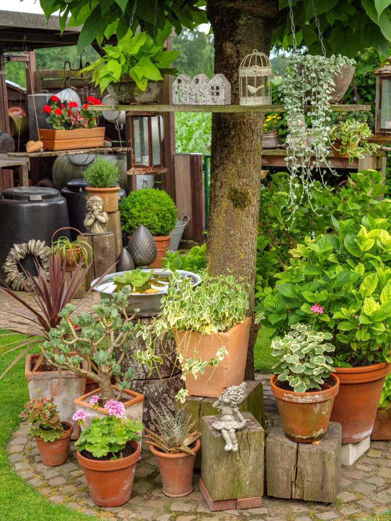 Rustic Shabby Chic Garden Decor with Potted Plants and Lanterns